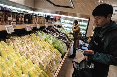 接到订单后,23岁的生鲜分拣员郭柱(化名)拿着购物袋,来回穿梭在超市货台前,“顾客在APP一下单,我们这边的倒计时就开始了。”