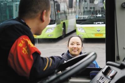 2月17日,北京公交集团第七客运分公司,妻子袁纪红发车前叮嘱丈夫马占军注意安全。本版摄影/新京报记者 侯少卿