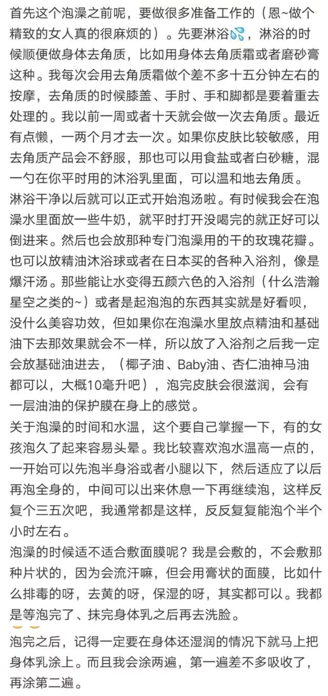 这里给大家划一下重点,先淋浴(过程中去角质)——放牛奶(干玫瑰花瓣或入浴剂)——精油(10ml左右)——开始泡澡——先泡半身再泡全身——泡澡过程中(喝红酒、吃水果补充水分、放音乐增加仪式感,放松自己,敷面膜)——半个小时左右泡澡完毕—身体乳涂两遍。