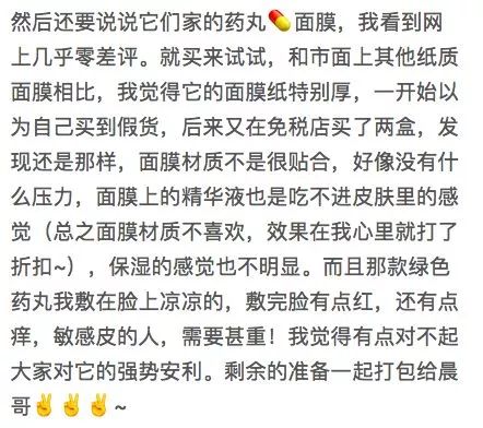 同品牌的另外一款很火的“药丸面膜”,范冰冰当然也买来试了,面膜材质不符合她的预期,效果似乎也不咋地,敷完脸还有点红痒,“吓”得她准备把剩下的面膜全打包给李晨。