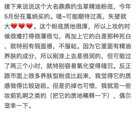 And某品牌最近非常火的虫草精油粉底,冰冰试用过后却说“期待过高,失望就大”:粉底质地厚,上妆很难打薄打匀;粉底色是死白的,特别容易有假面感;虽然含有精油成分,但上妆后两三小时就会容易氧化暗沉。总结两个字:难用!