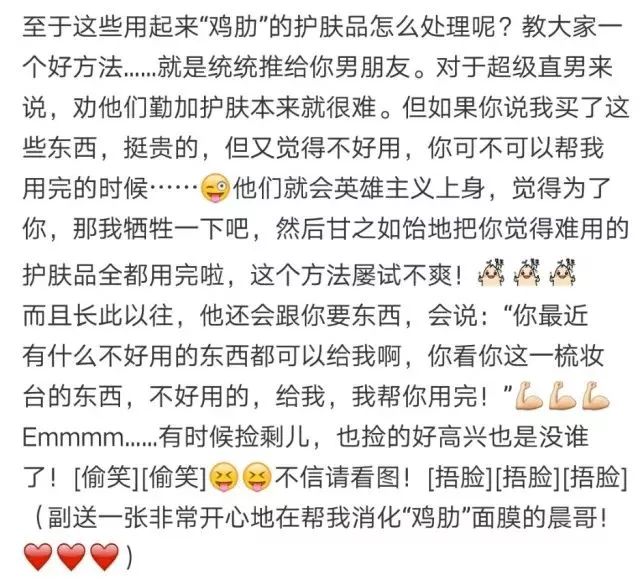 另外,她还很贴心的给出了大家如何处理这些“鸡肋”护肤品的方法——统统推荐给你的男朋友。
