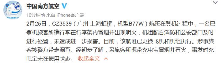中新网2月25日电 中国南方航空官方微博今日通报称,2月25日,CZ3539(广州-上海虹桥,机型B77W)航班在登机过程中,一名已登机旅客所携行李在行李架内冒烟并出现明火,机组配合消防和公安部门及时进行处置,未造成进一步损害。