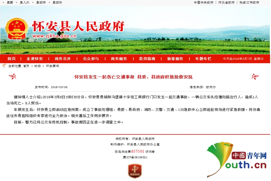 3月6日,怀安县人民政府发出“怀安县发生一起伤亡交通事故县委、县政府积极抢救安抚”公告称,据知情人士介绍:3月6日15时30分许,怀安县城柴沟堡镇十字街工商银行门口发生的因公交车失控造成的交通事故,一辆公交车失控撞向路边行人,造成1人当场死亡,8人受伤。