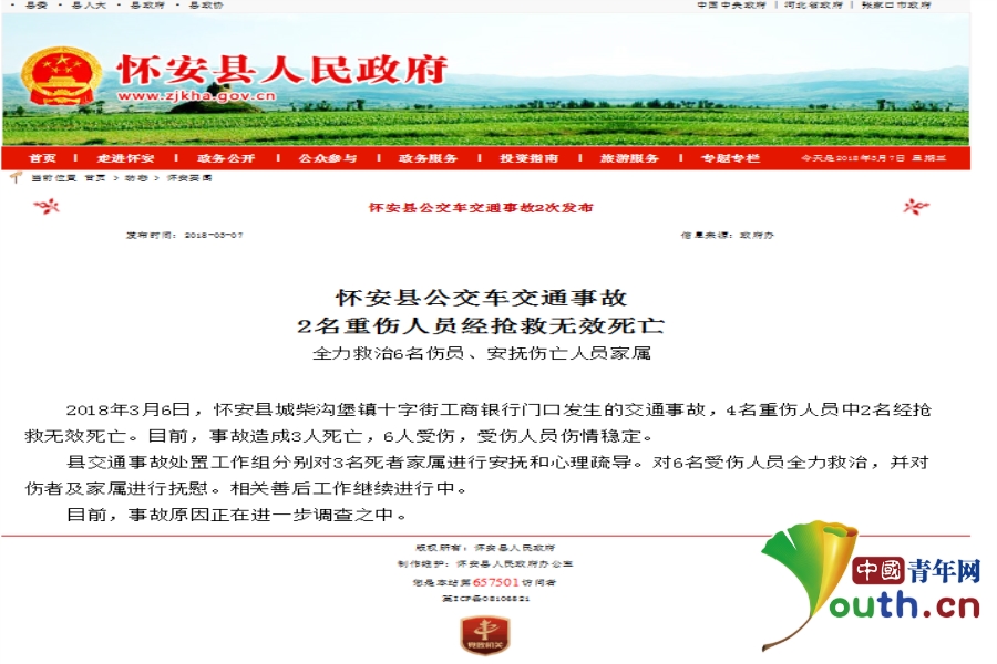 怀安县公交车交通事故2名重伤人员经抢救无效死亡。图片来源于怀安县人民政府