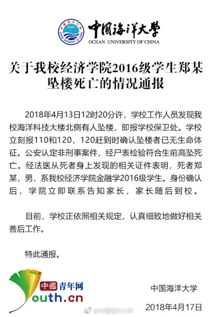 中国青年网北京4月18日电 17日晚,中国海洋大学发布通报称,该校一名学生坠楼身亡,尸表检验符合生前高坠死亡,公安认定非刑事案件。
