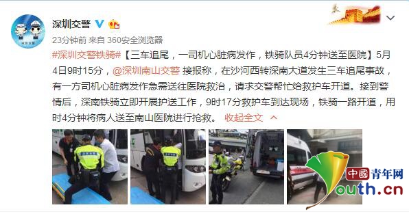中国青年网北京5月4日电 据广东省深圳市公安局交警支队官方微博@深圳交警消息,4日9时15分,深圳南山交警接到报警,沙河西转深南大道发生三车追尾事故,一方司机心脏病发作急需送医治疗,交警接警后仅用4分钟将病人送至南山医院进行抢救。
