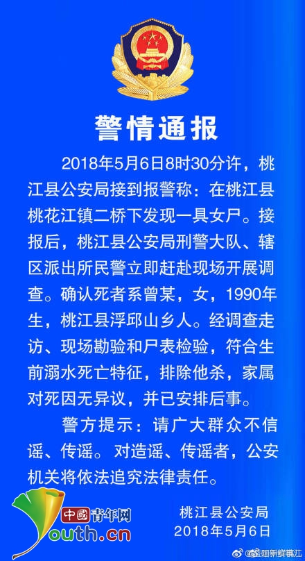 确认死者系曾某,女, 1990年生,桃江县浮邱山乡人。经调查走访、现场勘验和尸表检验,符合生前溺水死亡特征,排除他杀,家属对死因无异议,并已安排后事。