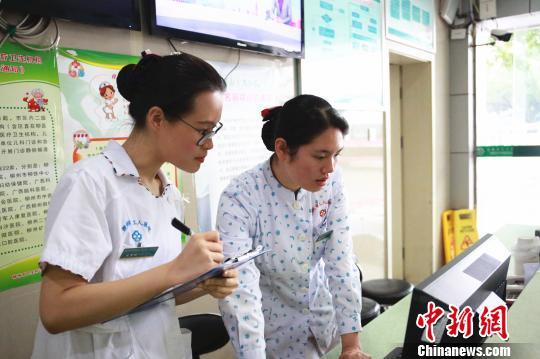 王梦琪(左)在和前辈学习引导病人就诊。 朱柳融 摄