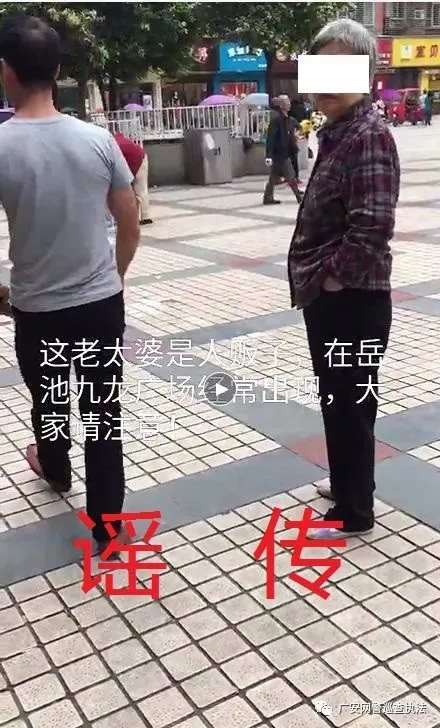 中国青年网北京5月30日电 近日,四川省广安市岳池县流传着一段“人贩子”视频,其中一段画面上配有“这老太婆是人贩子,在岳池九龙广场经常出现,大家请注意!”等字样。30日,广安市公安局通过官方微信公众号辟谣,称视频内容不实,被误当成人贩子的老人实为主动帮助顾客寻找小孩。