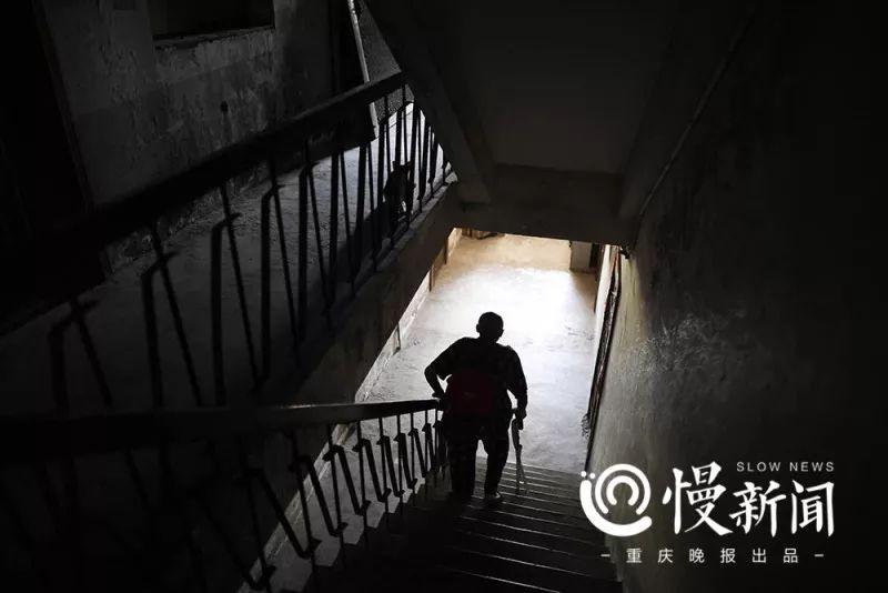邓林明住的老房子没有电梯,他一手拄三角凳一手扶栏杆,腰身佝偻,从10楼慢慢下楼。