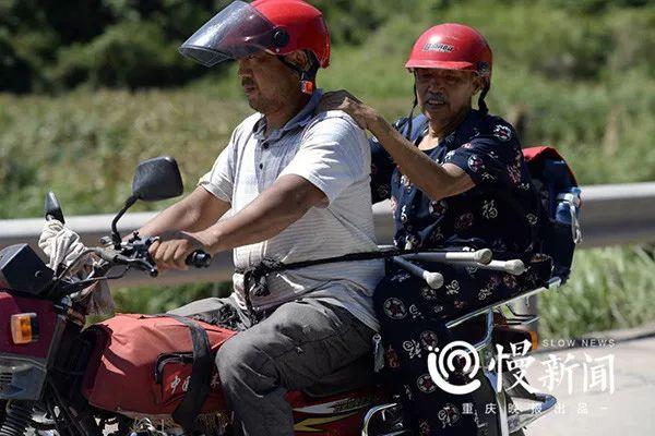 摸摸索索爬上摩托后座,老人手在抖,车主拿一条捆货物的绳子,一头缠在邓林明腰上,一头捆在自己身上。遇到坑洼路段,后座上的老人被腾空弹起, 看得人心里一紧。