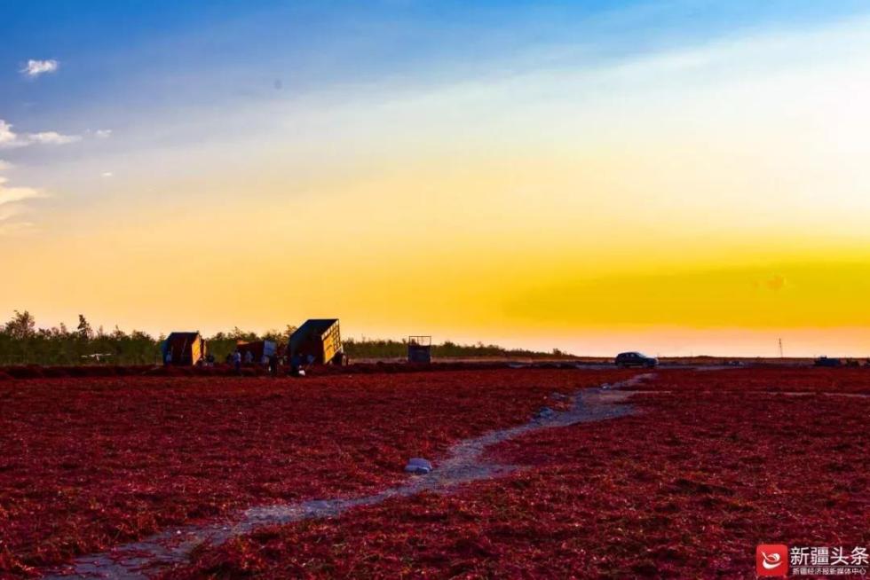 红辣椒结的红彤彤一片,田埂上堆起一座座辣椒“小山”,沙湾县安集海镇辣椒种植户齐先生正往农用车上装辣椒。每年9月到10月,沙湾县的戈壁就成了晒场,方圆几十公里如红色海洋,吸引大量游人来观赏拍照。