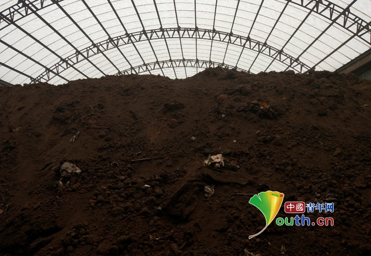 挖掘机挖出的疑似工业残渣和泥土,堆积在鹤伴山集团工厂的一处大棚内。记者宿希强 摄
