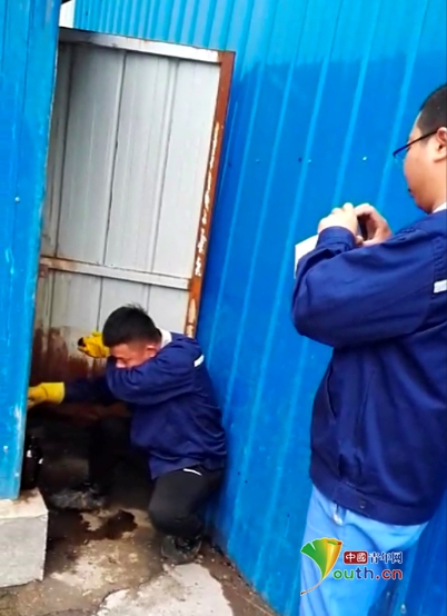 污水取样的工作人员掩鼻抵挡臭气。视频截图。