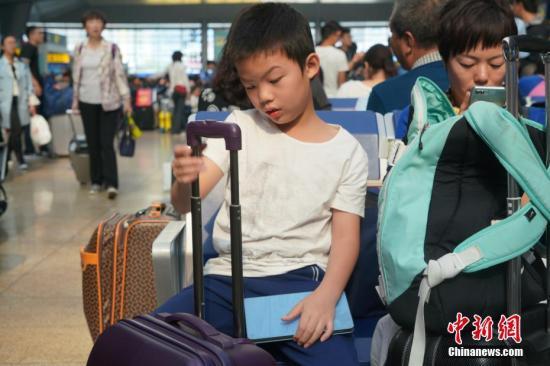 10月1日,小男孩在北京南站内候车时玩弄行李箱。当天是国庆假期首日,北京南站迎来客流高峰。中新社记者 张兴龙 摄