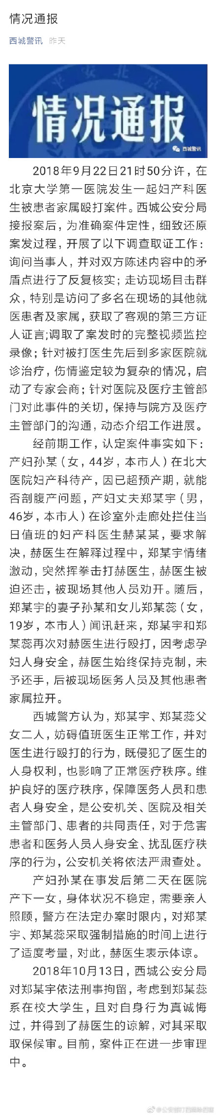 近日,“北大医院妇产科医生被患者家属殴打”事件引发关注。10月13日晚,北京市公安局西城分局在“西城警讯”微信公众号发布情况通报,其中一名打人者被刑事拘留,另一名打人者是在校大学生,被取保候审,目前案件正在进一步审理中。