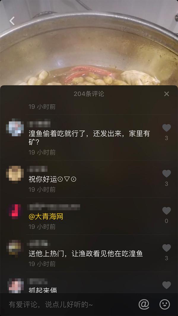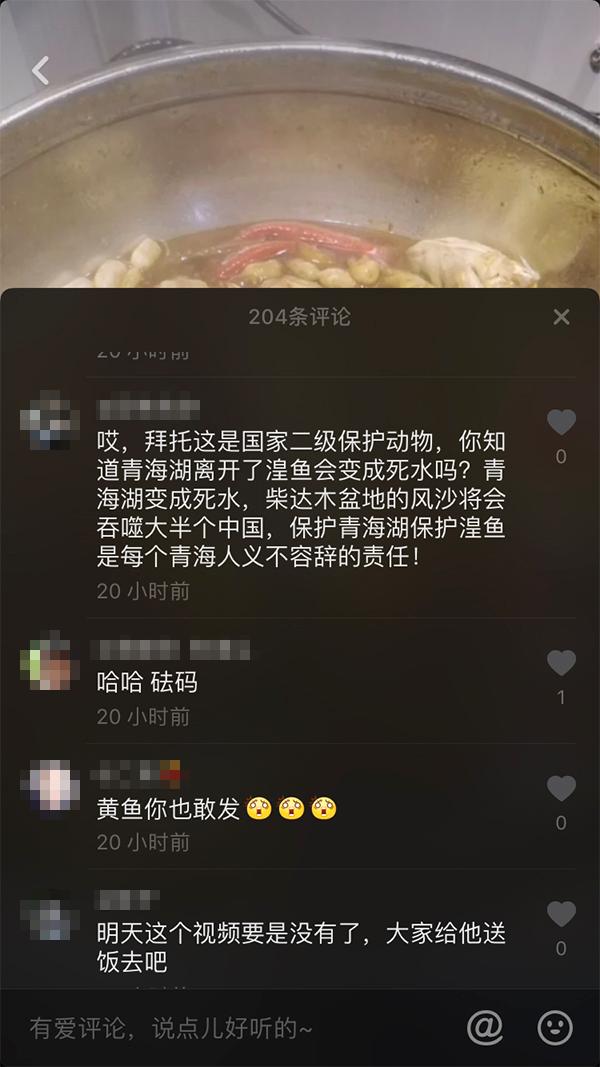 网友“哈凯哥”抖音视频截图及评论。图片来源:综合网络“食用湟鱼并拍视频传播的行为十分恶劣,湟鱼属国家二级保护动物,食用湟鱼是违法的。”李先生表示,青海省政府已颁布对青海湖封湖育鱼的通告,该通告明令禁止单位或个人加工、销售、食用湟鱼。如视频情况属实,该网友将会被处以1万元内的罚款或15天内的拘留。