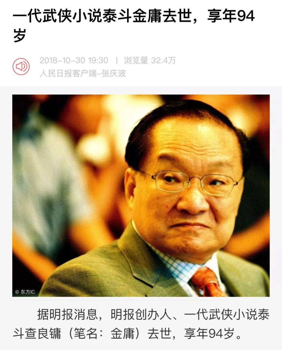 悲痛!据人民日报援引明报消息,笔名为“金庸”的武侠小说泰斗查良镛逝世,享年94岁。