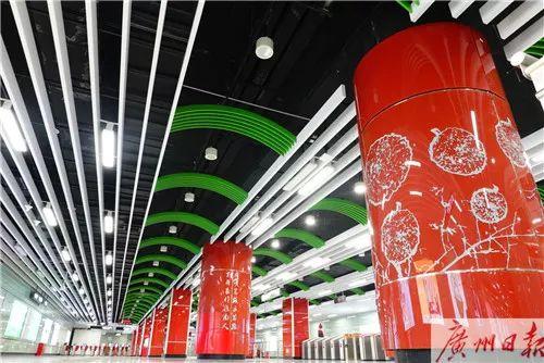 车站集中展示了荔枝文化,用绿色的天花铝板和墙面玻璃创造舒适的氛围。