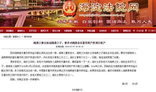中新网客户端北京1月7日电(任思雨)据北京市海淀法院网消息,因对著名词作家阎肃音乐著作权收益分配比例无法达成一致,阎肃之妻李老太、阎肃之女阎女士将阎肃之子阎先生诉至法院,要求对被继承人阎肃享有的音乐著作权之财产权进行析产,判令李老太享有三分之二,阎女士享有六分之一。日前,海淀法院受理了此案。