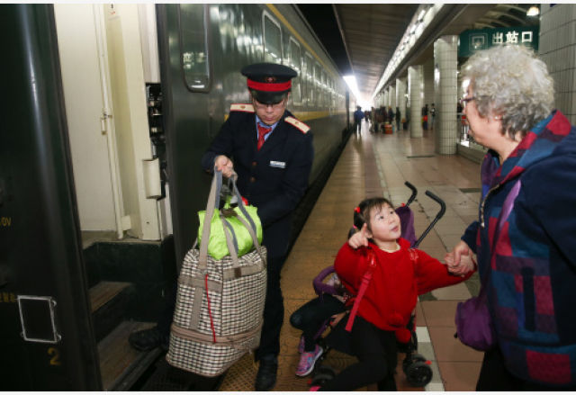 Z99次列车的列车员在帮助旅客搬运行李 新华社记者 丁汀 摄