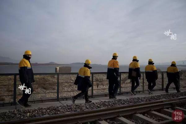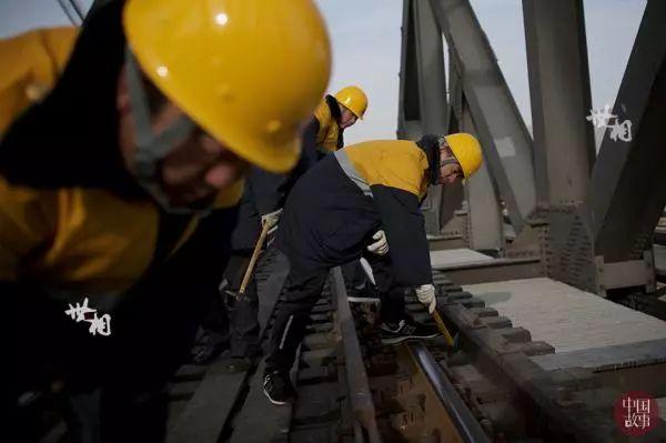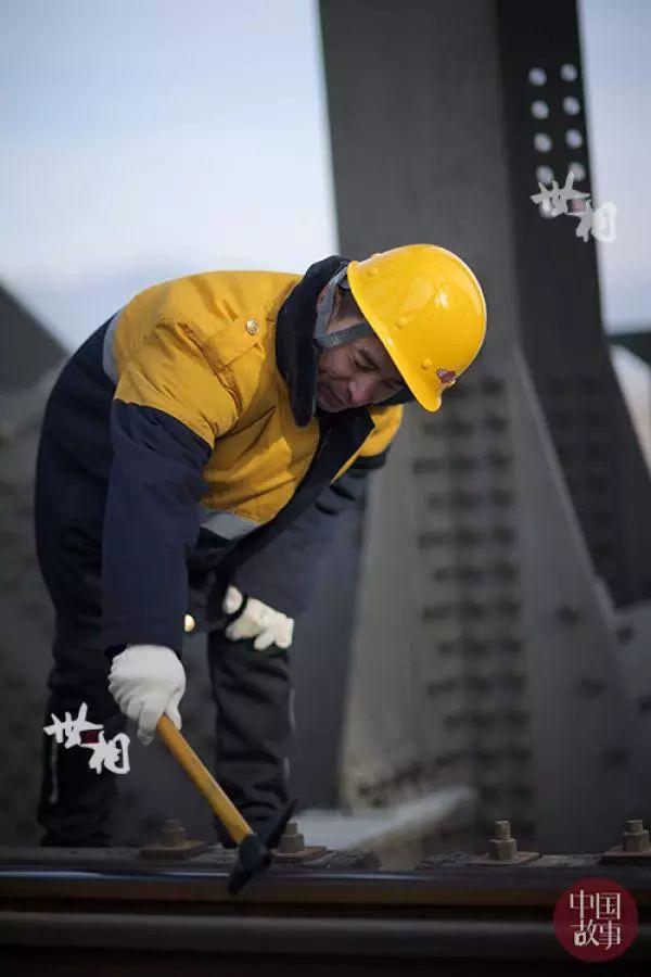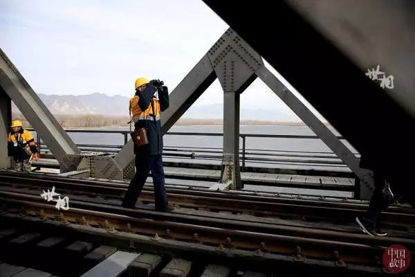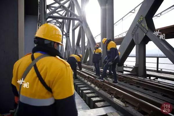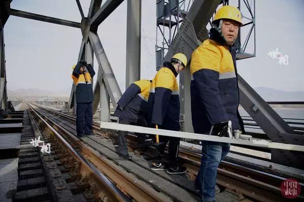 马立明所在的桥梁工工队有十余名工人,每天要一起从大桥最南端走到最北边。作业分工明确,有人携带道尺负责丈量铁轨间距,有人携带扳手负责检查螺栓是否拧紧,有人用工锤敲打铁轨凭回音检查铁轨质量,有人用望远镜观察桥梁上方的螺栓,还有防护员携带信号旗负责维护工人安全。大家互相配合,互相帮助,共同走好这段近1公里的铁道桥检查路。
