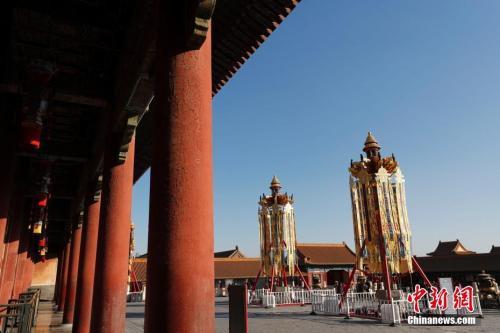 北京故宫博物院在乾清宫前丹陛上下树立起“天灯”和“万寿灯”。中新社记者 杜洋 摄