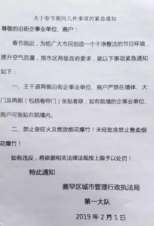 2019年春节前,有网友反映城管部门发布通知:主干道两侧禁止张贴春联。部分市民不解,认为“不贴春联没有年味”,商家表示自己想贴但不敢贴。呼和浩特城管对此作出回应,称为避免往年出现的节后春联破损影响市容市貌问题。