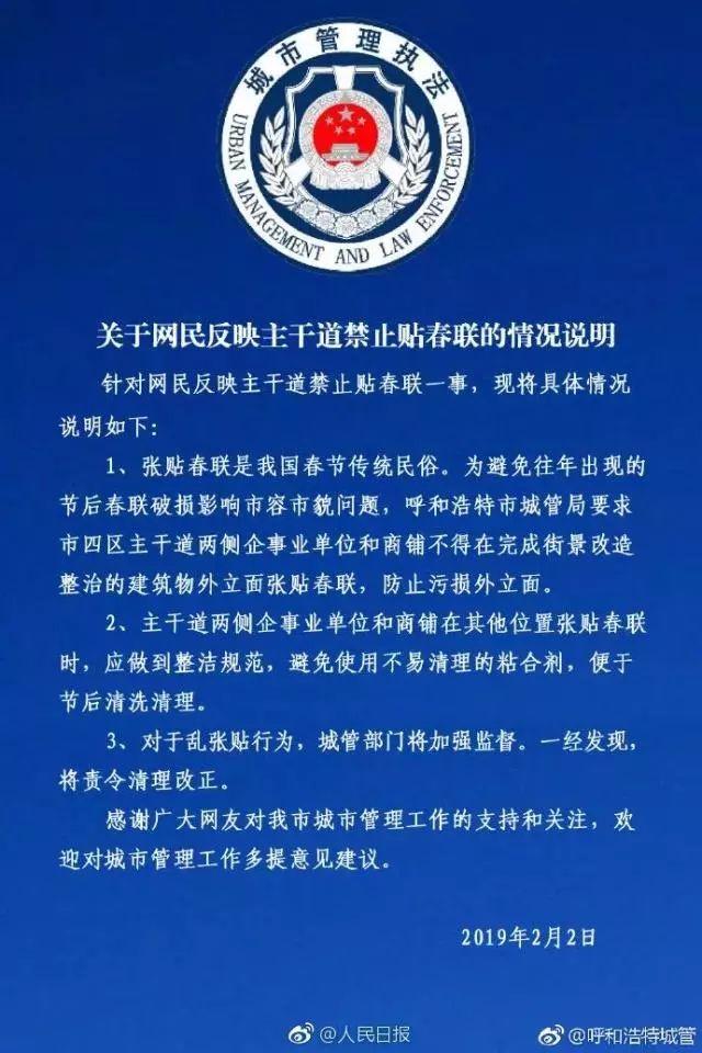 另据报道称, 面对公众的不满和质疑,呼和浩特市城管局又发布了一则关于网友反映主干道禁止贴春联的情况说明: “此次并非禁止市民张贴春联,而是要求主干道两侧企事业单位和商铺不要将春联张贴在如墙面、立柱上等已完成街景整治改造的建筑物外立面,可以将春联贴在本单位或商铺自身的门窗内外等其他易清理位置,如玻璃门内外、卷帘门上、窗户内,并做到整洁规范,避免使用不易清理的粘合剂,便于节后清理的同时,也不损害市容市貌。”