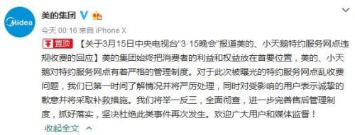 对此,3月16日凌晨,美的集团方面表示,美的、小天鹅对特约服务网点有着严格的管理制度。对于此次被曝光的特约服务网点乱收费问题,已第一时间了解情况并将严厉处理,同时对受影响的用户表示诚挚的歉意并将采取补救措施。未来将举一反三,全面彻查,进一步完善售后管理制度,抓好落实,坚决杜绝此类事件再次发生。