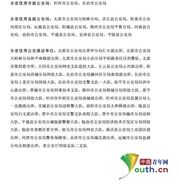 中国青年网太原3月18日电(记者 王子瑞)日前,从山西省公安厅获悉,山西公安机关有一大批优秀单位和优秀民警获得表彰。其中,山西省人力资源和社会保障厅、山西省公安厅联合决定,授予忻州市公安局、长治市公安局“全省优秀市级公安局”称号;授予太原市公安局万柏林分局等11个县级公安机关“全省优秀县级公安局”称号;授予太原市公安局尖草坪分局汇丰派出所等30个单位“全省优秀公安基层单位”称号;授予180名公安民警“全省优秀人民警察”称号。