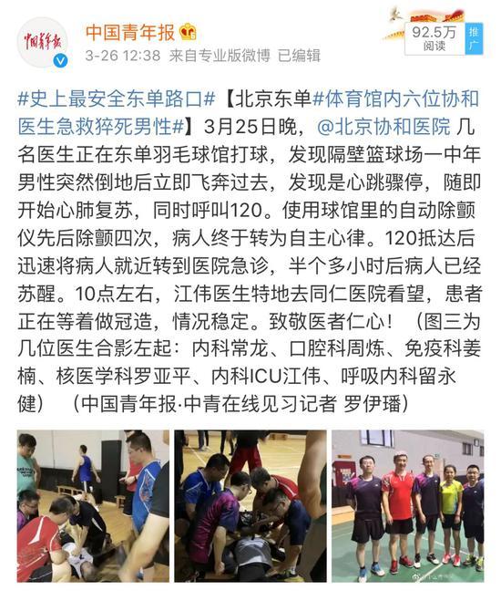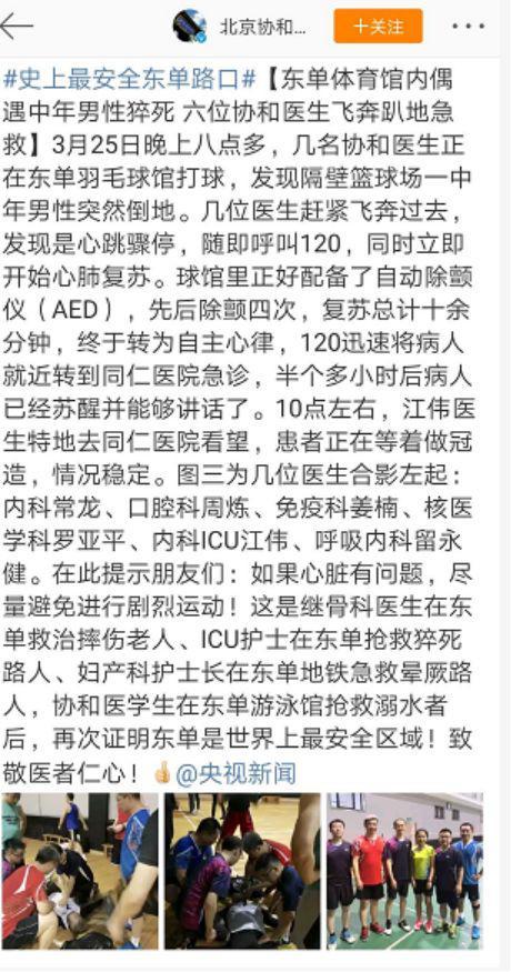 据微博@北京协和医院 消息,3月25日晚上八点多,几名协和医生正在北京东单羽毛球馆打球,发现隔壁篮球场一中年男性突然倒地。几位医生赶紧飞奔过去,发现是心跳骤停,随即呼叫120,同时立即开始心肺复苏。球馆里正好配备了自动除颤仪(AED),先后除颤四次,复苏总计十余分钟,终于转为自主心律。