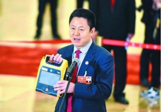 2018年全国“两会”期间,全国政协委员、北京阜外医院主任医师敖虎山手提自动体外心脏除颤器(AED)走上“委员通道”,呼吁普及心肺复苏培训,推广其在学校、企业等公共场所的普及。