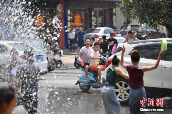 4月13日,街头充满欢乐的气氛。当日,在云南省德宏傣族景颇族自治州瑞丽市,泼水节欢乐依然在持续,民众相约走上街头泼水狂欢。中新社记者 刘冉阳 摄