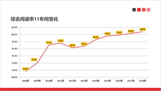 中国新闻出版研究院近日发布了第十六次全国国民阅读调查。数据显示,2018年我国成年国民各媒介综合阅读率为80.8%,较2017年的80.3%有所提升,数字化阅读方式(网络在线阅读、手机阅读、电子阅读器阅读、Pad阅读等)的接触率为76.2%,较2017年的73.0%上升了3.2个百分点。