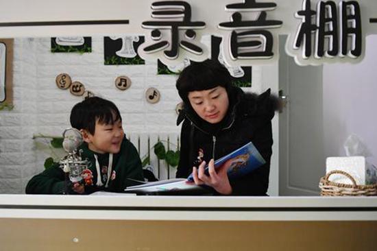 小朋友和家长在录音棚讲故事进行互动。图片来源新华社