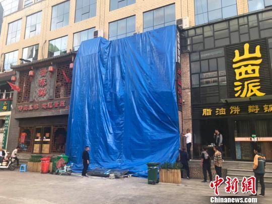 5月11日上午,位于山西省太原市万柏林区千峰南路的一饭店发生爆炸。当天下午,中新网记者赶到事发现场,该饭店门脸已被巨大的蓝色塑料布遮挡,门前拉起了警戒线。 李庭耀 摄