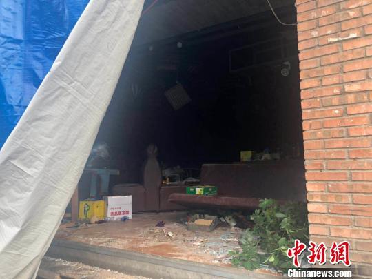 透过蓝色塑料布的缝隙,记者看到,事发饭店一楼十分杂乱,桌子、沙发等物品都已易位或倾倒,地板已蒙上一层灰色粉末,玻璃片、饮料瓶、盆栽等物品散落在地上。