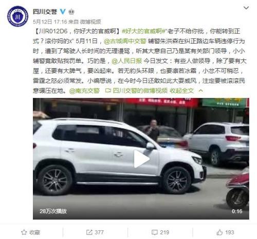 5月12日下午,四川省公安厅交警总队官方微博发文批评这莫名其妙的“官威”。微博发出后,不少网友纷纷表示“真是好大官威啊!”