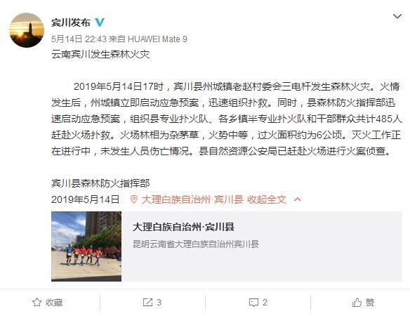 中新网5月15日电 云南省大理州宾川县人民政府官方微博通报一起火情:2019年5月14日17时,宾川县州城镇老赵村委会三电杆发生森林火灾。
