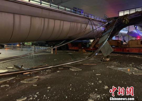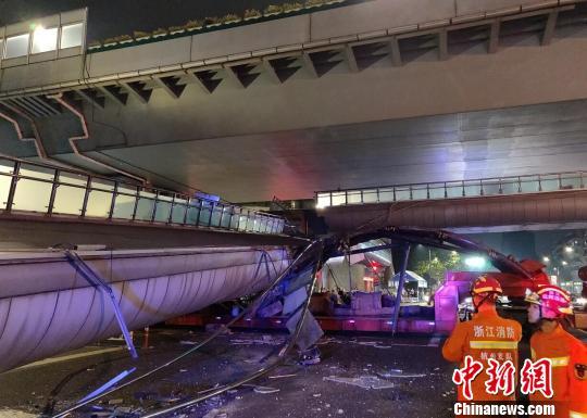 经查,2019年5月18日22时25分许,马某某驾驶皖SB62xx号重型牵引车,装载超高货物盾构机,途径杭州秋涛北路庆春东路口时,撞击到人行天桥东南段钢箱梁引桥(限高4.5米),使该段长33.5米、宽4米钢箱梁掉落,造成正行经该处的两辆浙A号牌轿车被砸及人行天桥、车辆所载盾构机受损的事故,损失金额上百万元。