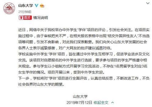 中新网7月12日电 山东大学12日下午通过官方微博回应中外学生“学伴”项目称,在项目实施过程中,由于审核把关不严,在相关报名表格中出现“结交外国异性友人”不当选项等问题,引发不良影响,对此深表歉意。下一步,学校将对“学伴”项目进行全面评估,认真总结反思,不断改进工作。