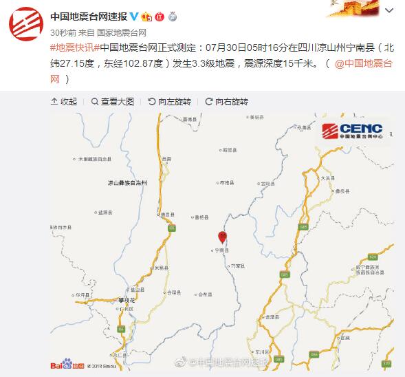 中新网7月30日电 中国地震台网正式测定:7月30日5时16分在四川凉山州宁南县(北纬27.15度,东经102.87度)发生3.3级地震,震源深度15千米。