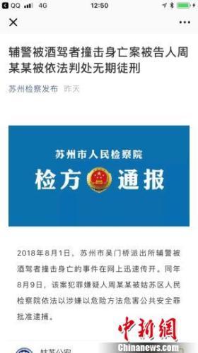 中新网南京8月27日电(记者崔佳明)2018年8月1日,苏州一辅警被醉驾者撞击身亡。27日,记者从苏州检方获悉,醉驾者周某某已被依法判处无期徒刑。