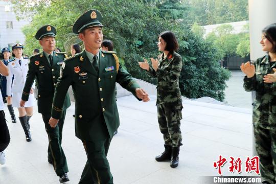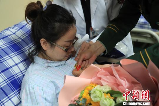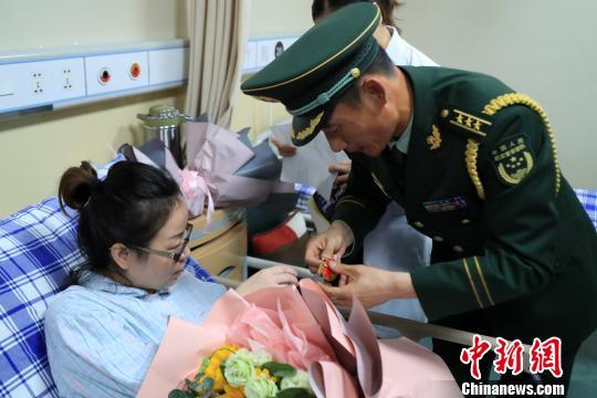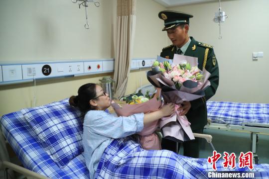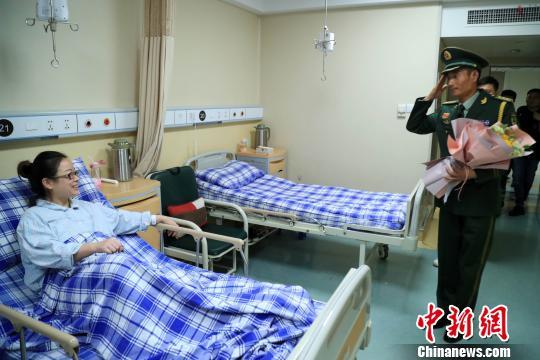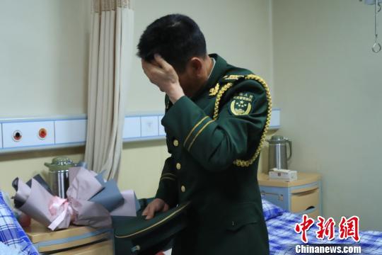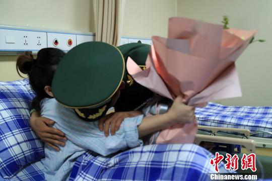 中新网杭州10月5日电(钱晨菲)4日,参加完国庆阅兵的武警浙江总队军官吕燕铭匆匆回到杭州,与病房中的妻子唐玉团聚。吕燕铭含泪把阅兵专用标志徽章挂到妻子胸前,“阅兵徽章里有你的一半。”