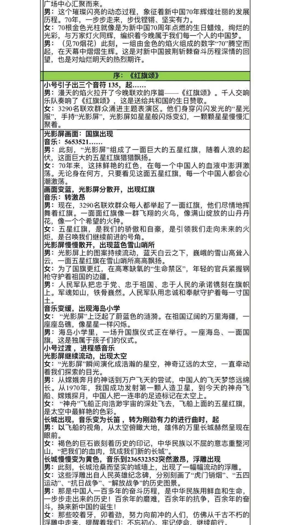 王艺: “标了一些数字‘1、3、5……’然后我们有一些编导就问我这是什么意思,我说是简谱。因为你没有办法用记画面的方式去解说,你只能通过听声音。所以,我们的稿子上就标好,这个旋律进行到第几段的这几个音的时候,你就开始说这句话,都是有设计的。还有一个准确是情感准,肯定我们都会很激动、紧张,但是你要适度,尽量为大家现场还原我们这台联欢活动。”