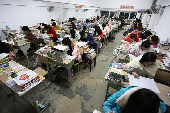 安庆师范大学的考研自习室里,学生们正埋头复习做冲刺。陈东/摄