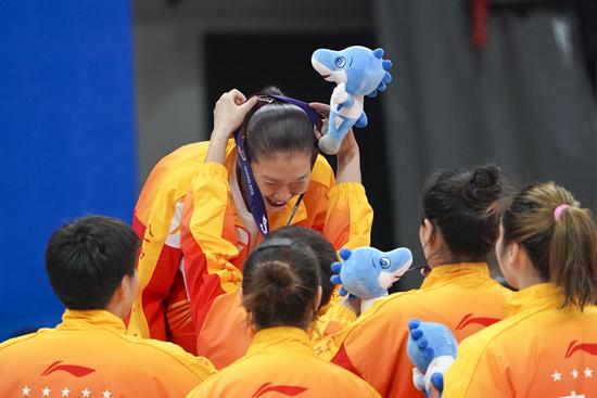 八一女篮队员为主教练展淑萍挂上金牌。视觉中国供图