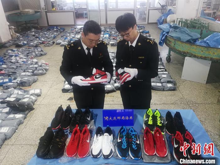 同日,大连邮局海关机检查验关员在对一批拟出境至法国、美国、日本等国的邮件进行X光机查验时,发现大量邮包中的物品图像显示为运动鞋,结合商品类别、包装、目的国等因素判断,存在一定的侵权风险。现场查验关员遂将该批邮包逐一开包查验,发现邮包中的运动鞋做工粗糙,且均带有与“耐克钩形图”商标高度近似的标识,经现场清点,该批邮包共有1042双涉嫌侵权运动鞋。